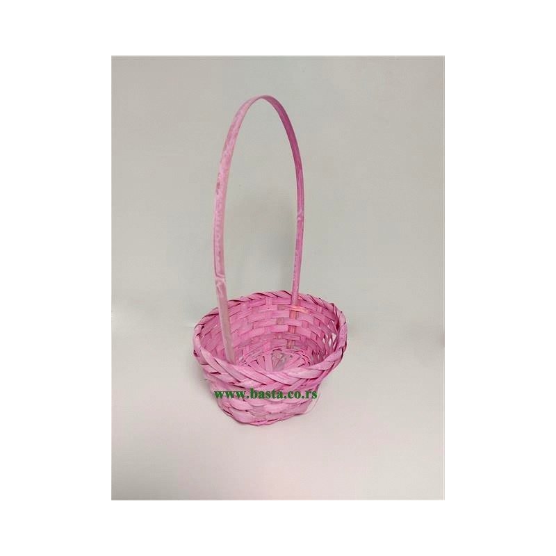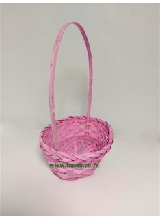 Pletena korpa u roze boji,dužina korpe sa drškom je oko 34cm,dužina korpe je oko 23cm,širina korpe je oko 19cm, dubina je oko 10cm.