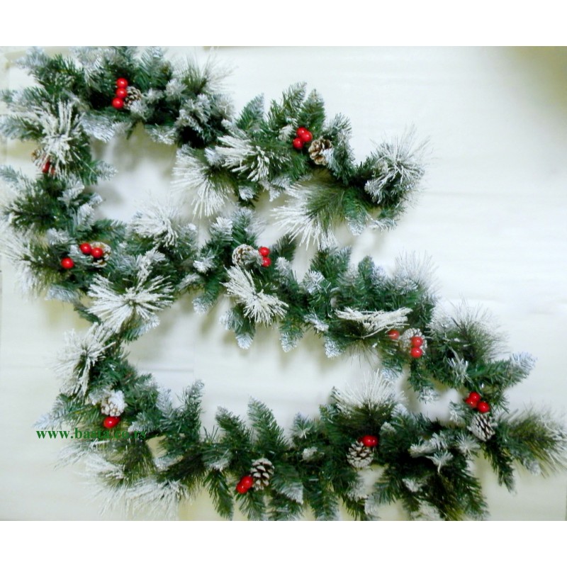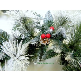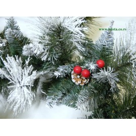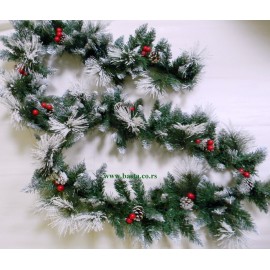 Girland dugačke iglice sa snegom ima na sebi i šišarke i crvene bobice. Visina je oko 2,7m.